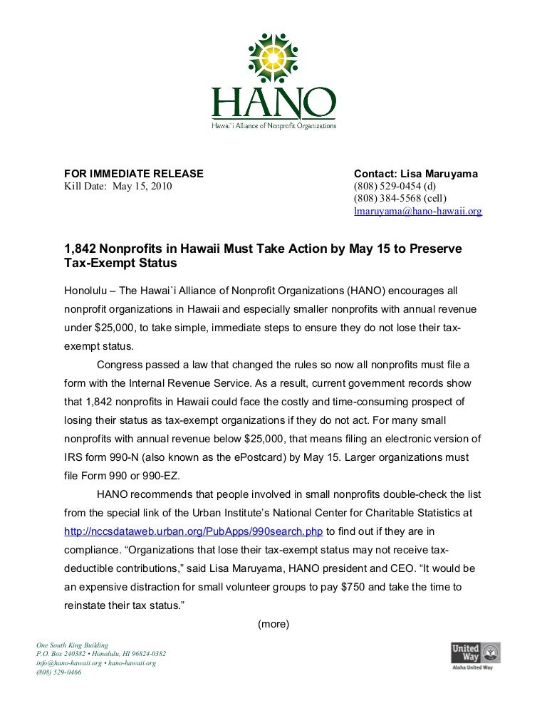 Hano News Release Nonprofit Tax Exempt Status At Risk 05 13 10
